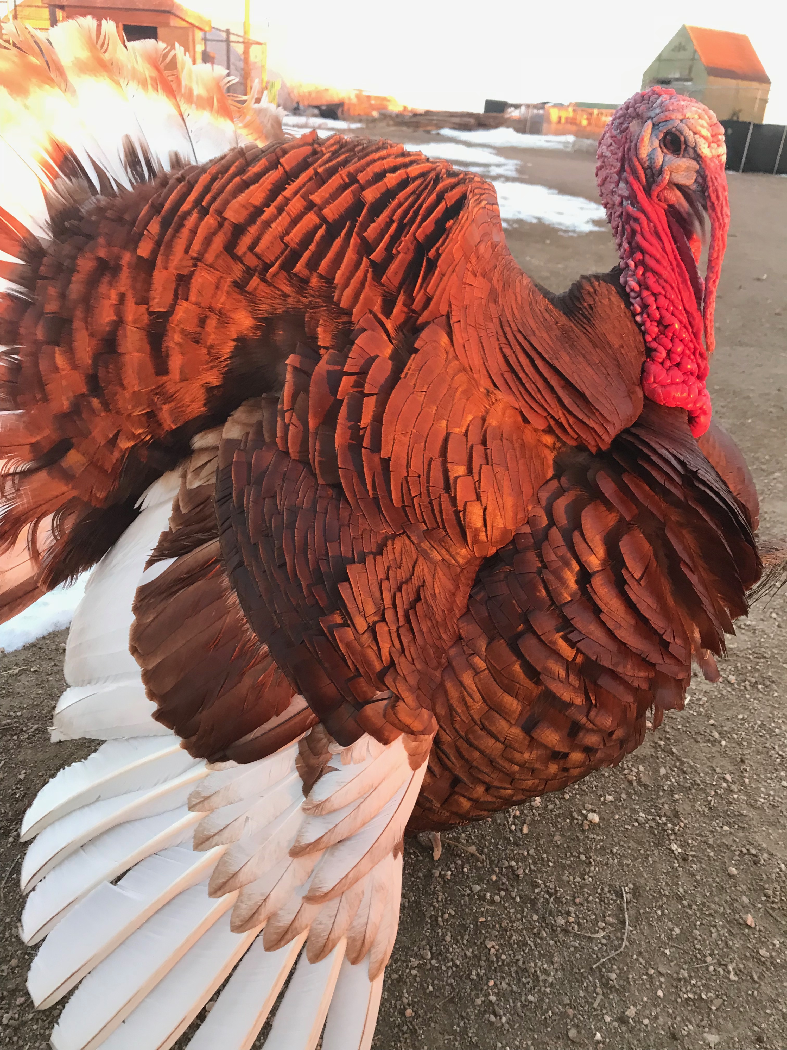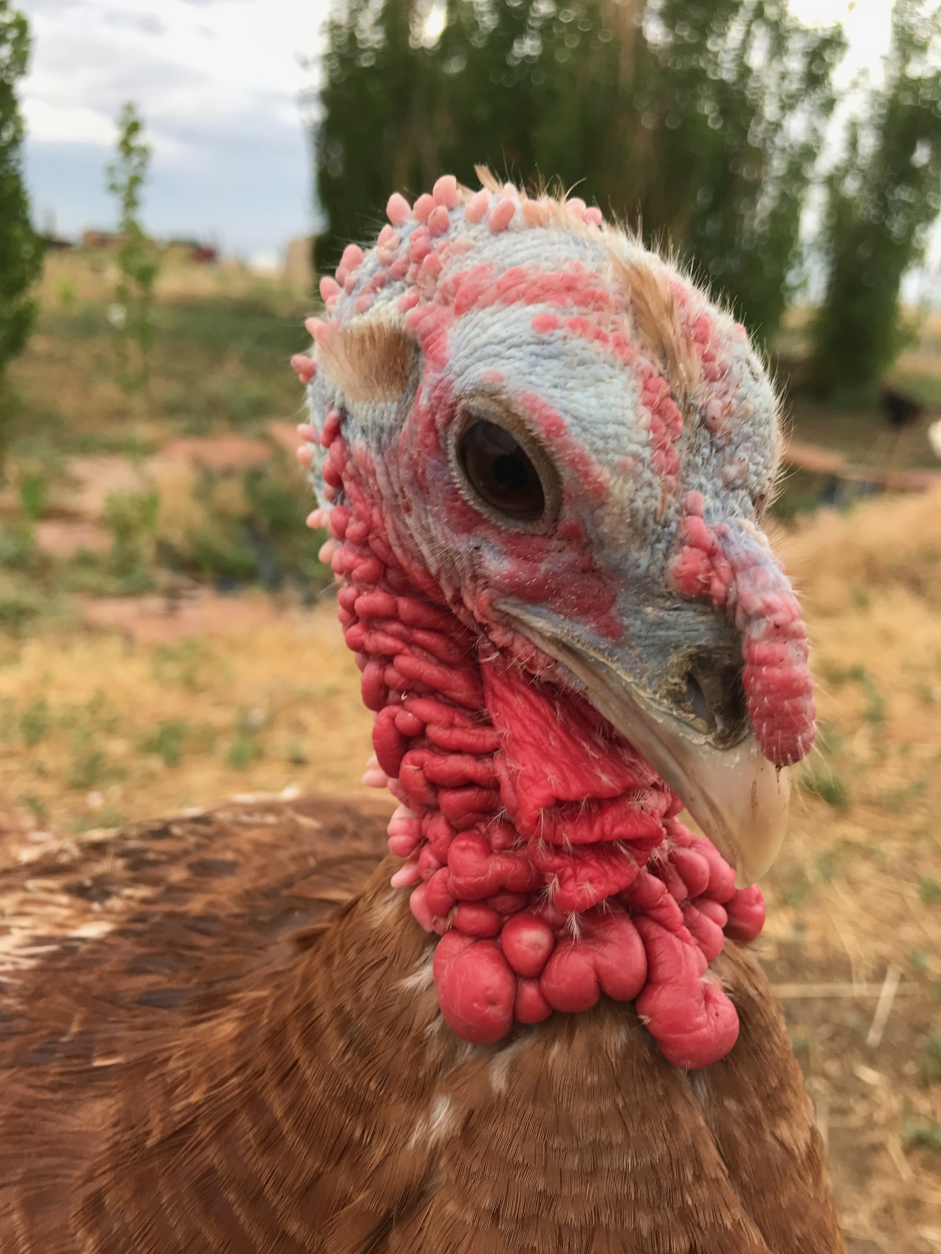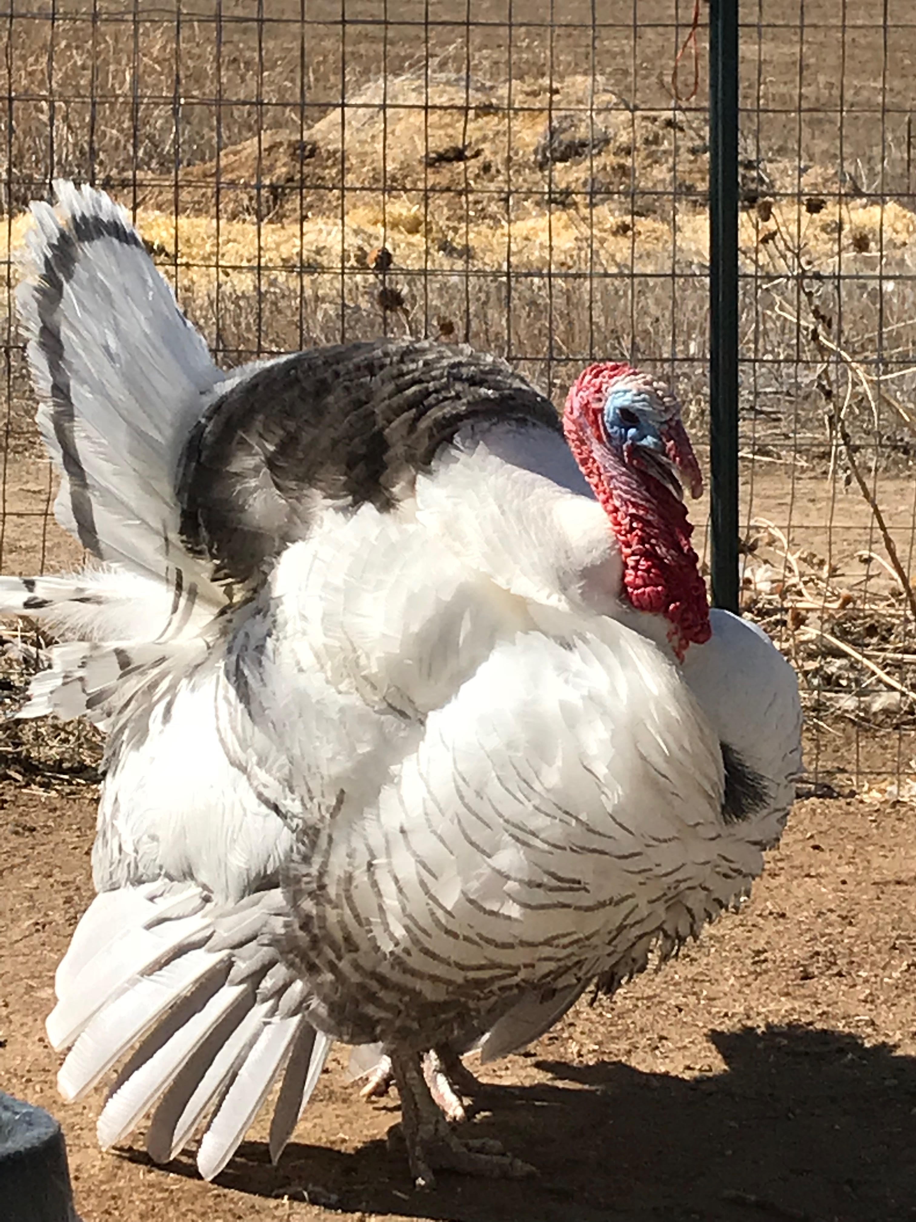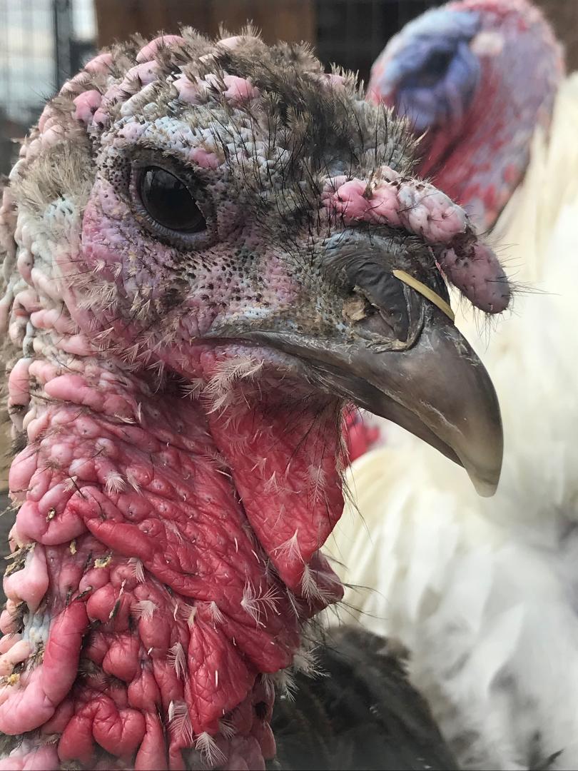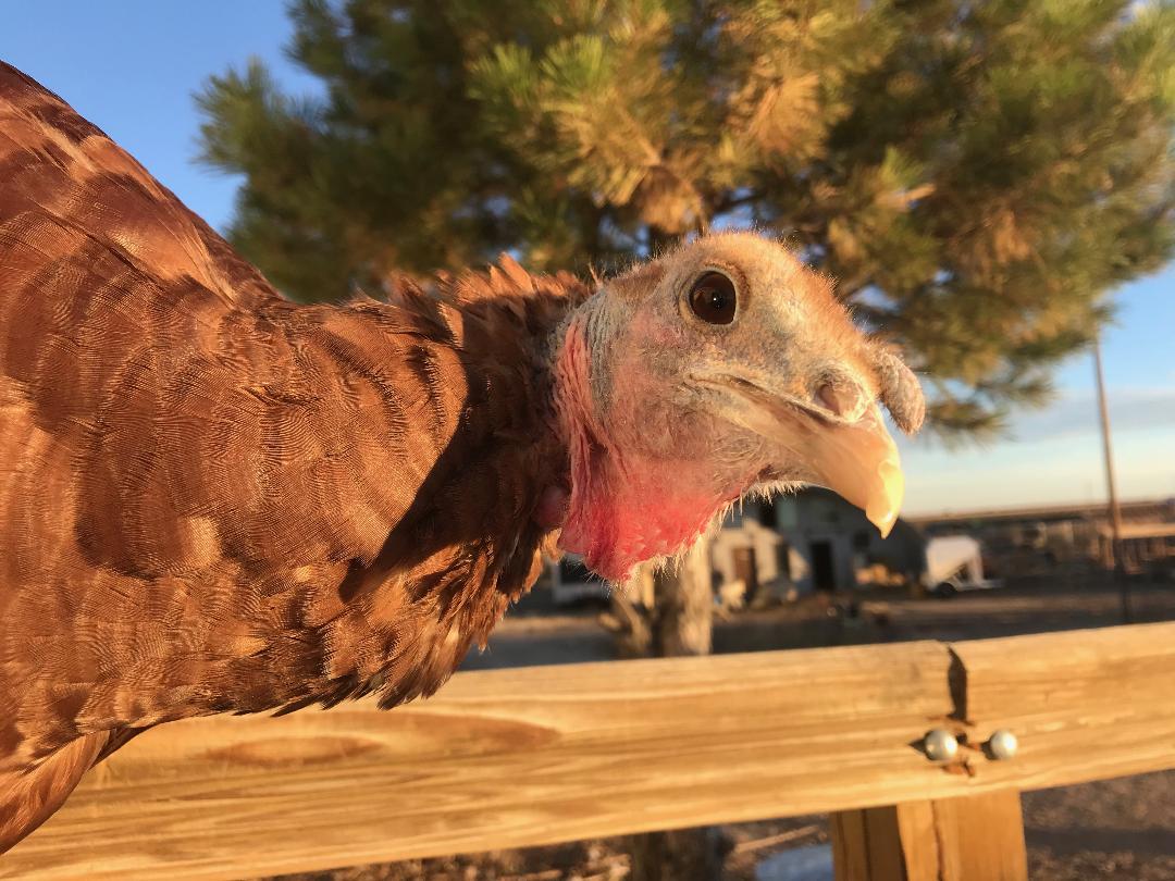This beautiful turkey hen is named Skipper. Quirky and feisty, Skipper is a critic of everyones attire. Skipper loves to be hugged if you're wearing a reasonable outfit. Pink boots are one of the many things Skipper will not tolerate. Always a companion to her favorite people, Skipper is full of vibrant personality and life. She's sweet, yet doesn't hold back her feelings about bad style. Skipper was being sold at a feed store with Sailor Todd when a visitor negotiated their release.